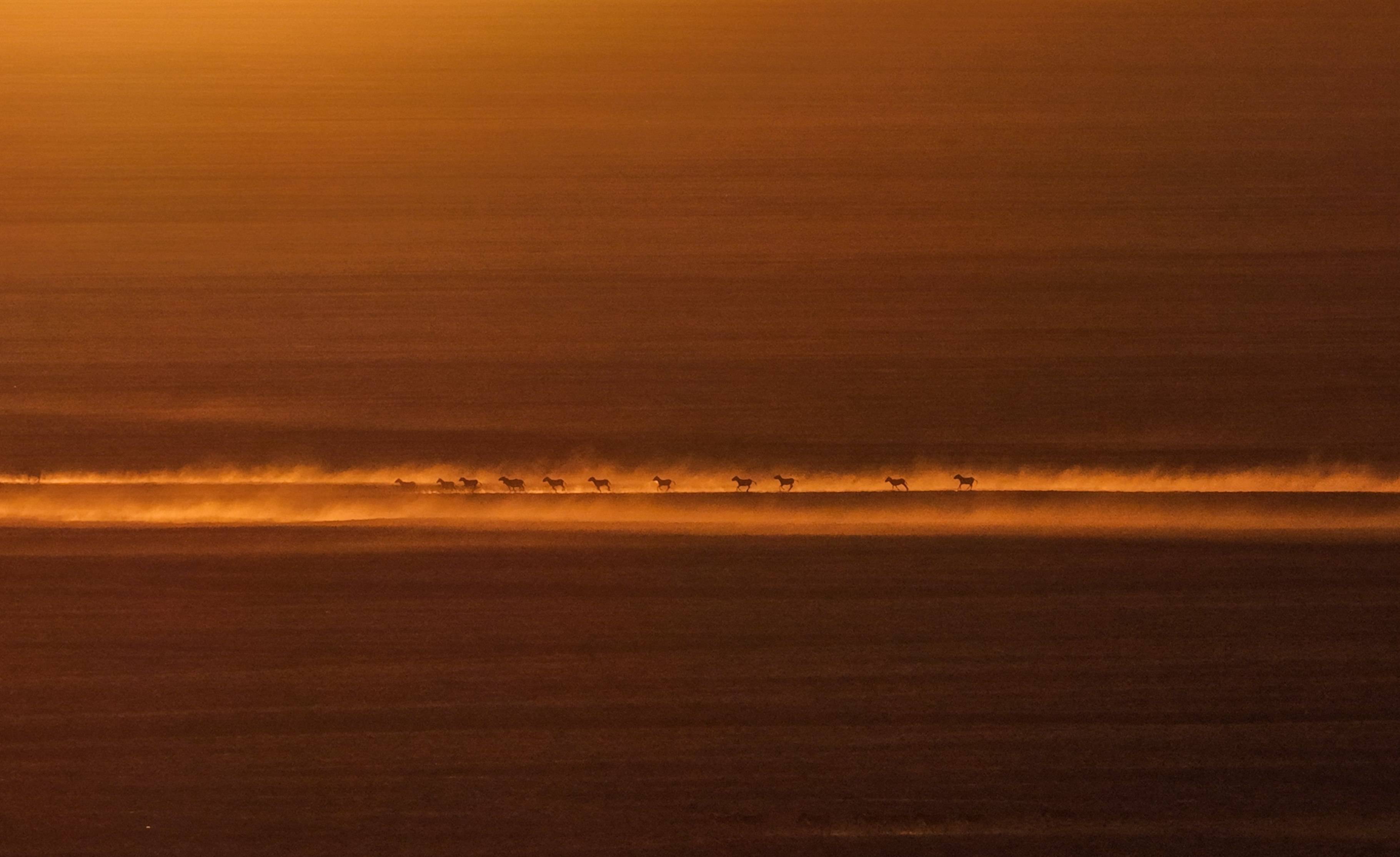 在阿尔金山国家级自然保护区,藏野驴奔跑在日出时的依协克帕提草原上(无人机照片,12月9日摄)。新华社记者 辛悦卫 摄“保护区地形复杂、路途遥远。夏季沼泽遍布,抵达最远的管护站往往需要数天。”保护区秋尔卡卡检查站站长铁木尔巴图说。高原天寒地冻,含氧量几乎只有平原的一半;随时发生的狂风暴雪和零下40摄氏度的低温都是这片原始旷野带给人类的极限考验。