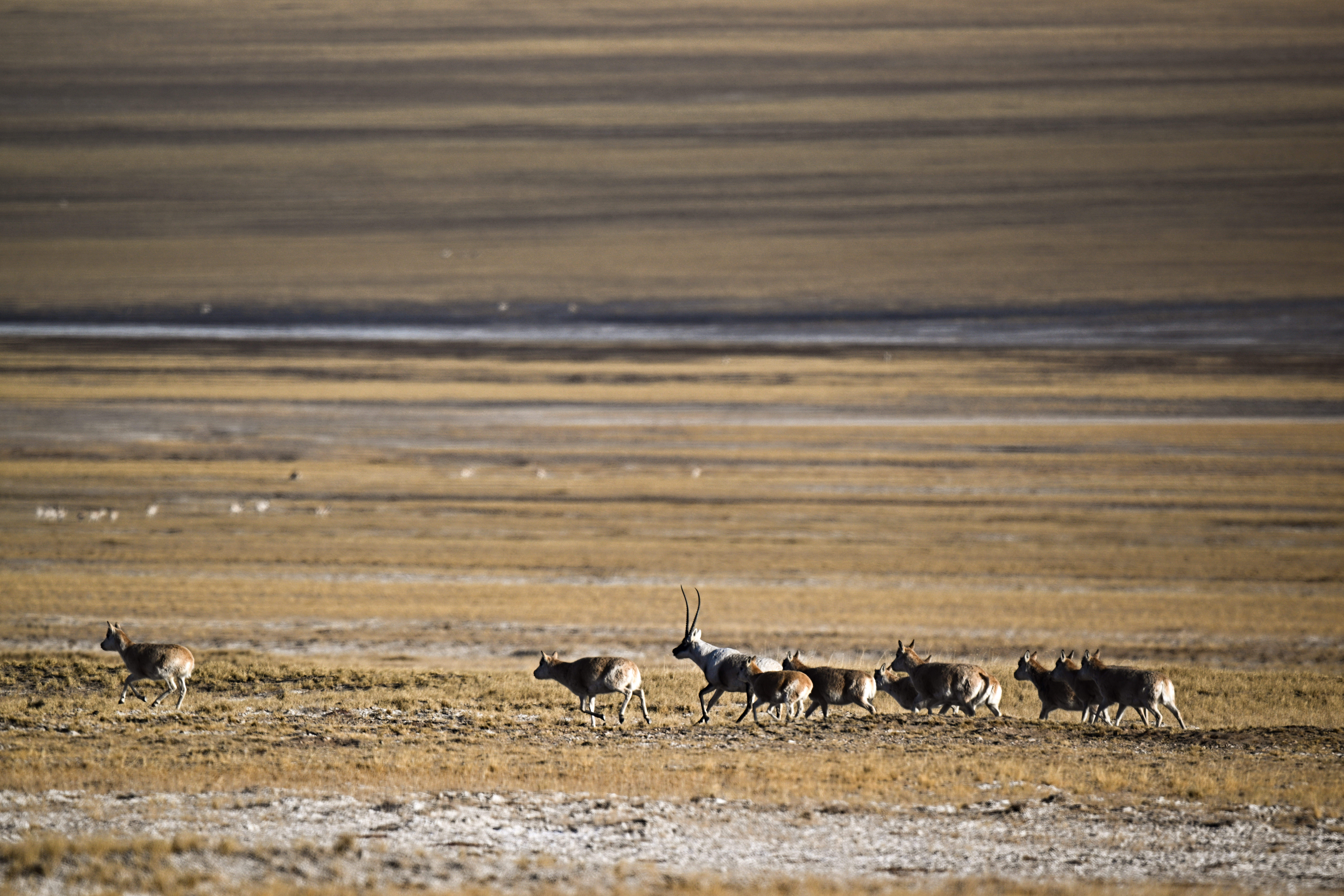 在阿尔金山国家级自然保护区,一只雄性藏羚羊带领雌性觅食(12月6日摄)。新华社记者 辛悦卫 摄不远处,公藏羚羊与母藏羚羊竞相奔跑,阳光从山间穿过,将公藏羚羊黑白相间的皮毛染成金色。“太好了,粗略估计这个片区就有八千只。”尚鹏欣喜地举起长焦镜头,记录下公藏羚羊求偶时激烈追逐母藏羚羊的画面。